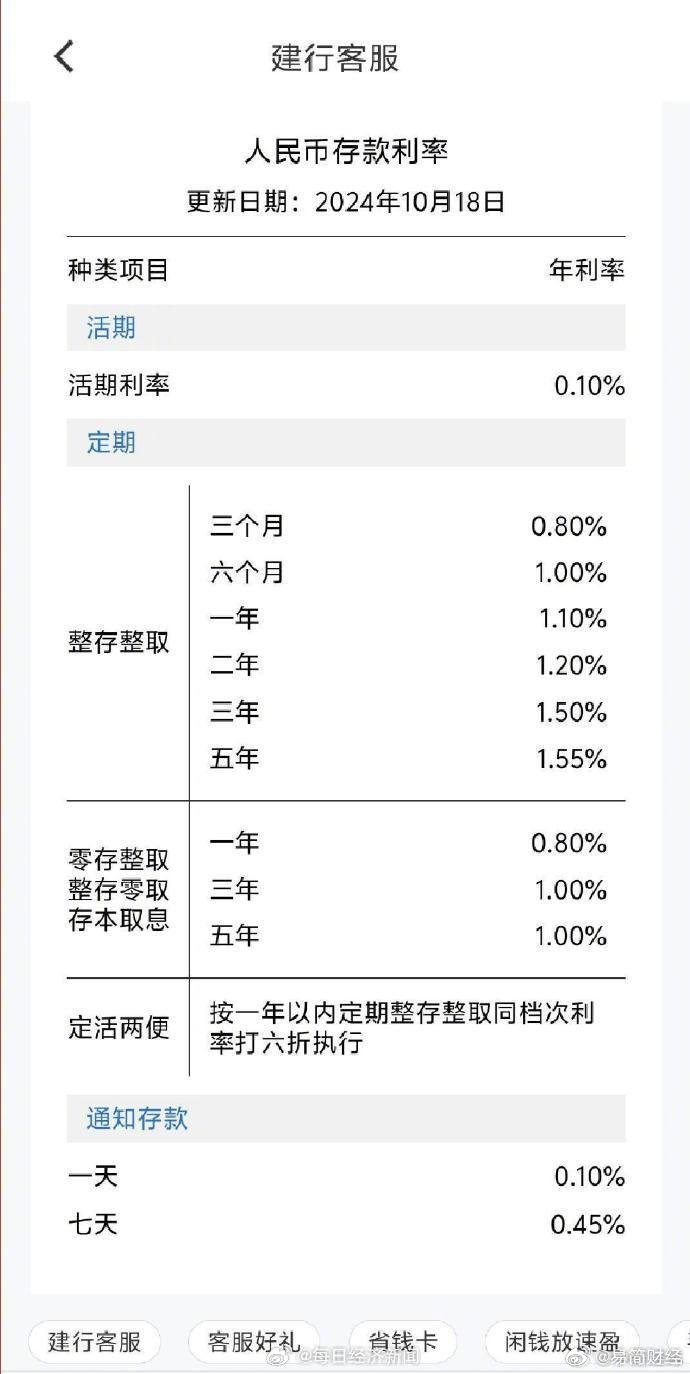 【#三大国有行下调存款利率#:#10万存款年息少250元#】18日,工商银行、建设银行、交通银行手机银行均已更新存款挂牌利率。其中,三个月期、半年、一年期、二年期、三年期、五年期定期存款挂牌利率均下调25BP至0.80%、1.00%、1.10%、1.20%、1.50%、1.55%。7天期通知存款利率下降25BP至0.45%,1天期通知存款利率下降5BP至0.10%。存款利率下调25个基点,意味着银行客户10万元存款1年利息收入将减少250元。